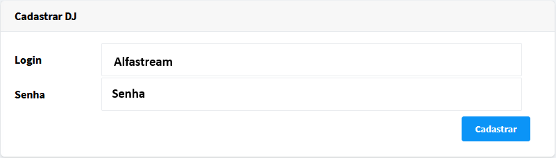 2 - No quadro Cadastrar DJ, defina um login (usuário) e uma senha para que este DJ possa se conectar ao servidor. Clique em Cadastrar.